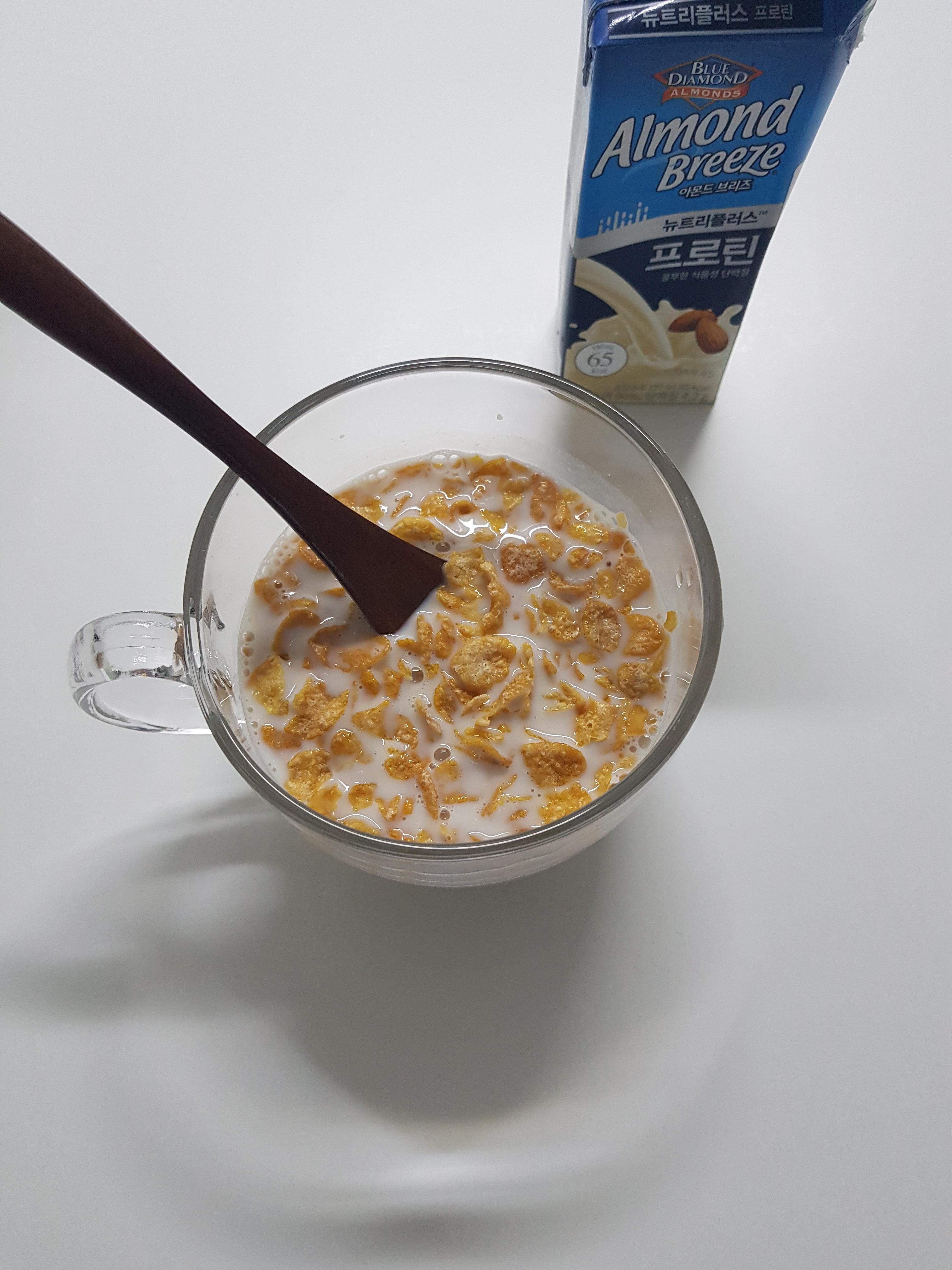 우유대신에 아몬드브리즈에 씨리얼 먹으구용