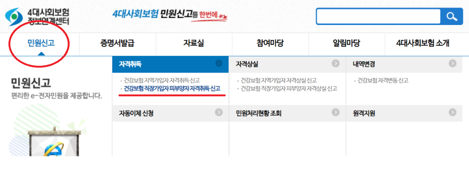 아래 빨간메뉴의 피부양자 자격 취득 신고에
